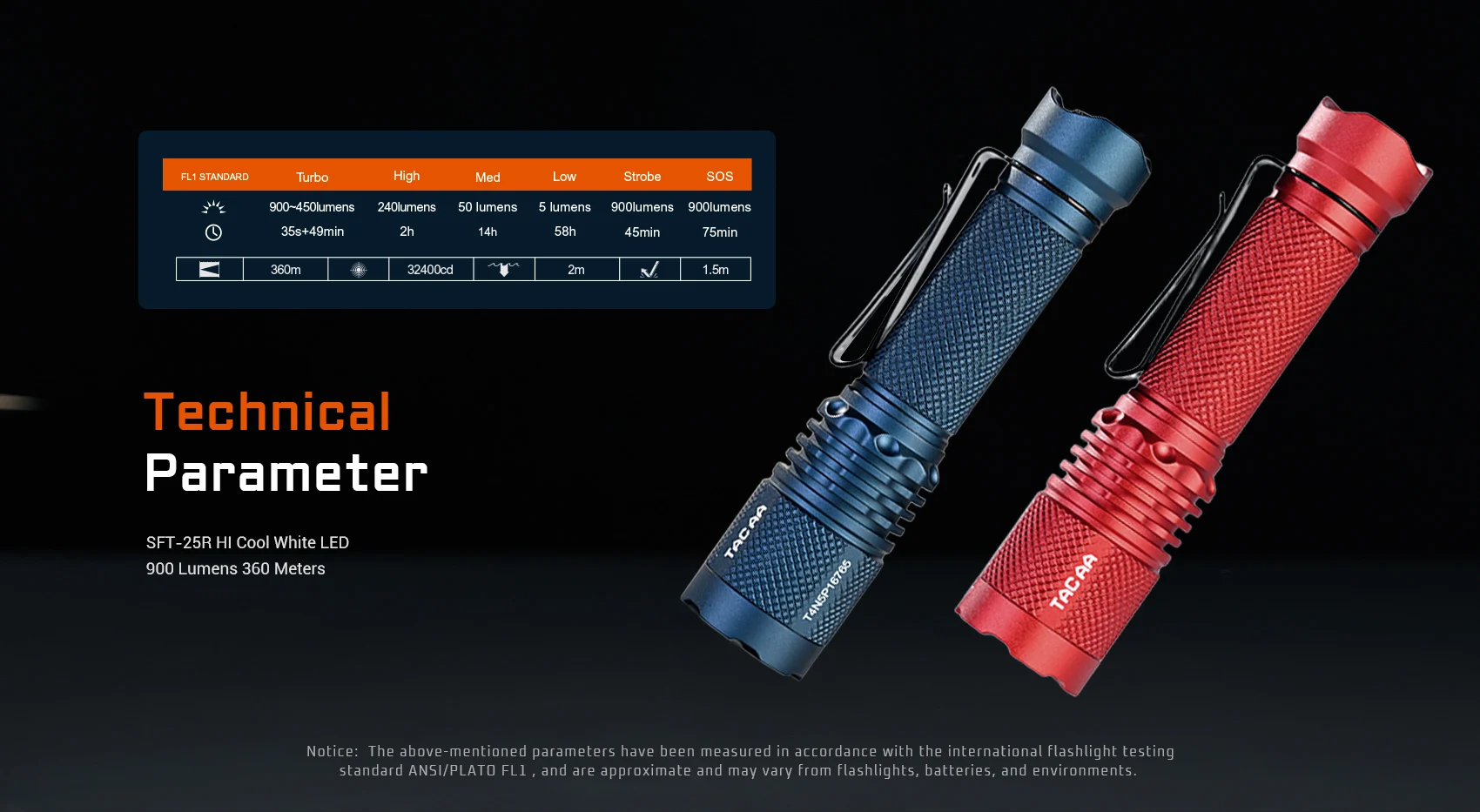 🌟Utilizes a Luminus SFT-25R HI 6500K LED with max output 900 lumens and max throw of 360 meters