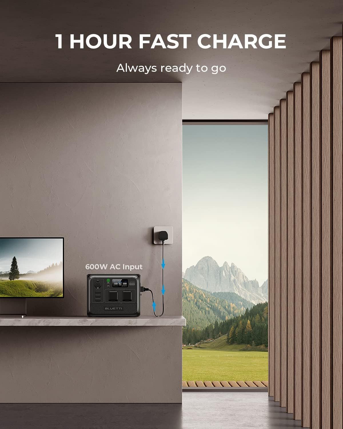 [1 Hour Fast Charge] - Plug AC60 into a wall outlet and charge in 1 hour at max 600W. You can also charge it via solar panels and your car. So no worries about power shortages.