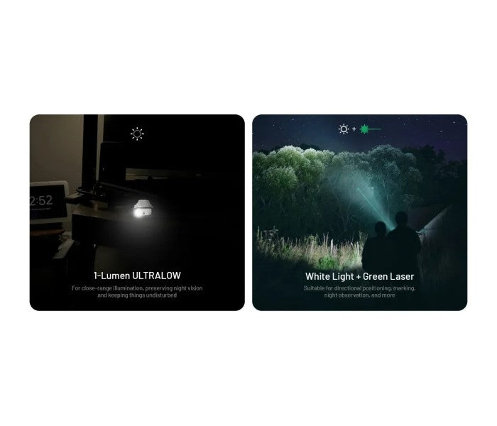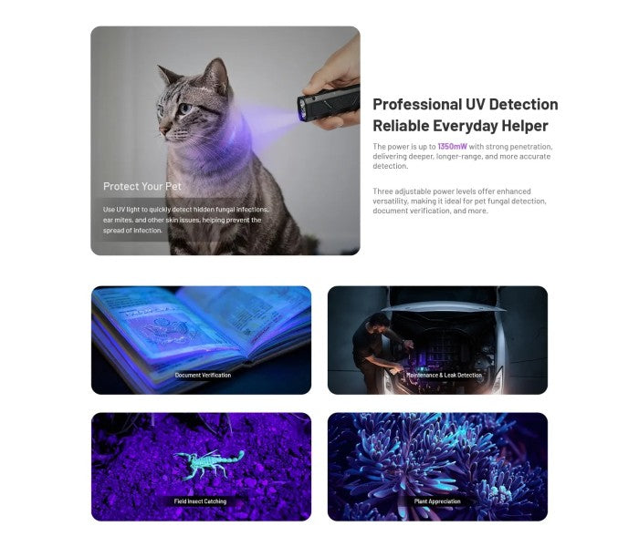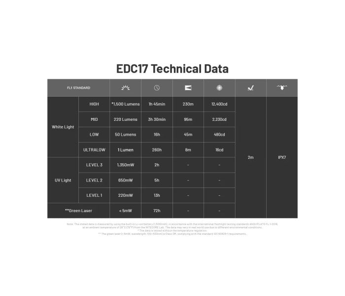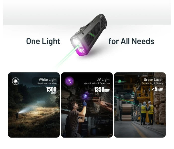 The EDC17 features three light sources: white light, UV light, and green laser for different lighting needs. The white light provides a max output of 1,500 lumens and 4 brightness levels. The UV light offers 3 levels and is ideal for fungal infection detection, document verification, maintenance and leak detection, and more. The
