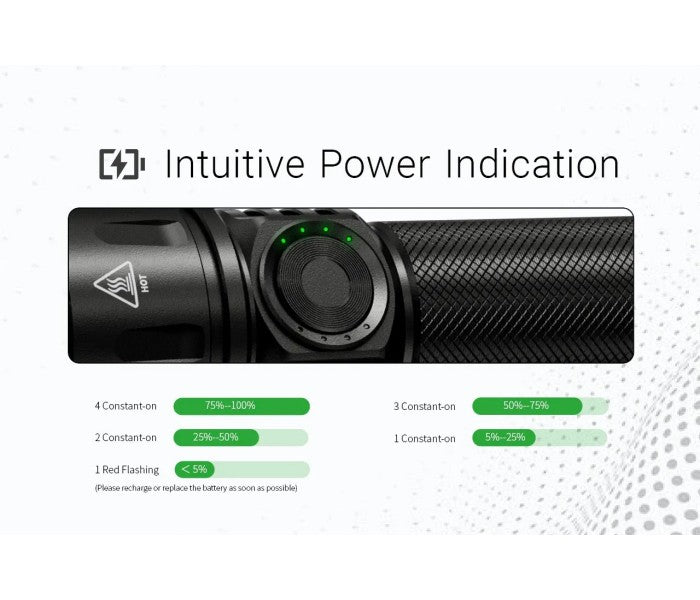 - Level indicators and power indicators available for indicating the current brightness level and remaining battery power