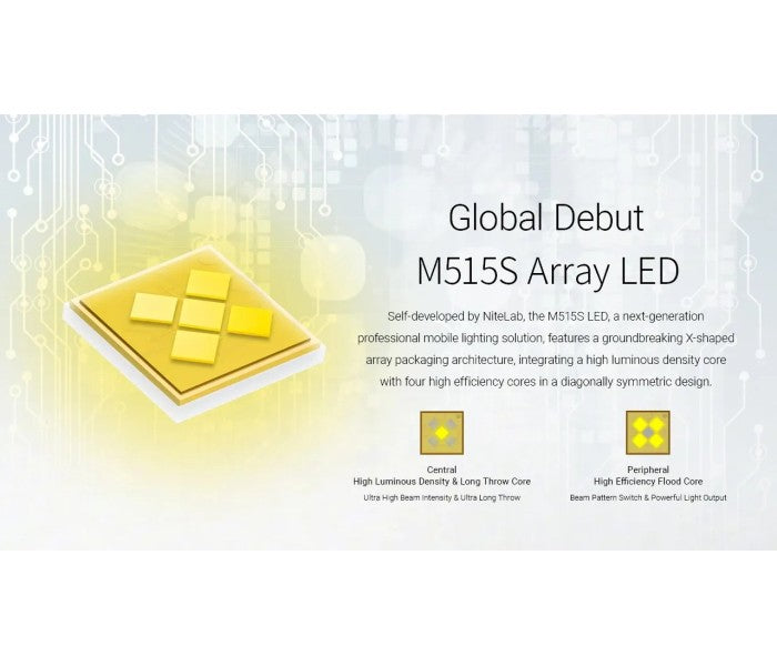 The Nitecore EX7 is equipped with 4 globally debuting M515S array LEDs. Each M515S LED features a groundbreaking X-shaped array packaging architecture and smaller power distribution units, enabling flexible power allocation, effective heat dissipation and enhanced overall efficiency, ideal for various beam pattern needs. With a denser core arrangement, the LED emits a more uniform beam spot, delivering smoother and more flexible beam pattern control.