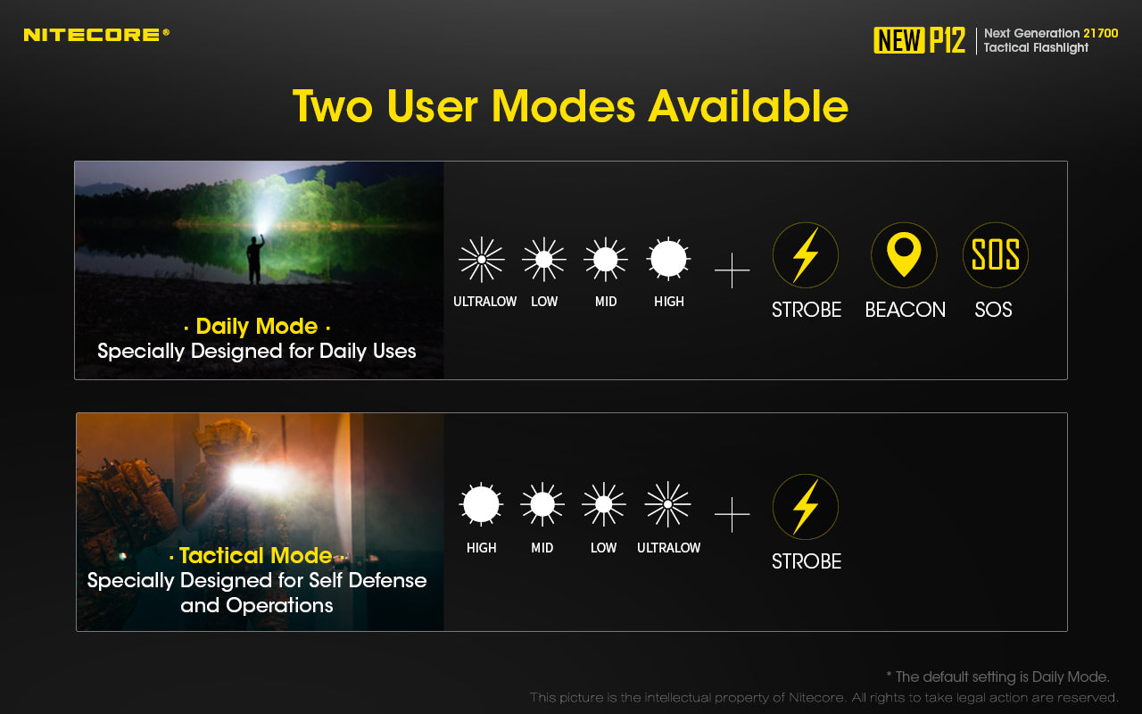 The New P12 offers two user modes to ensure you have quick access to the desired level. The daily mode is specially designed for general, everyday use and has all four brightness levels, plus the three special modes of strobe, beacon and SOS. For self defence and tactical operations, the tactical mode accesses the four brightness levels and strobe mode only. To switch between the two modes, click the tail switch while holding the side button for approx. 5 seconds.