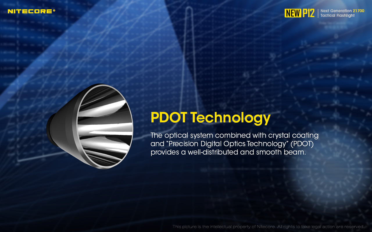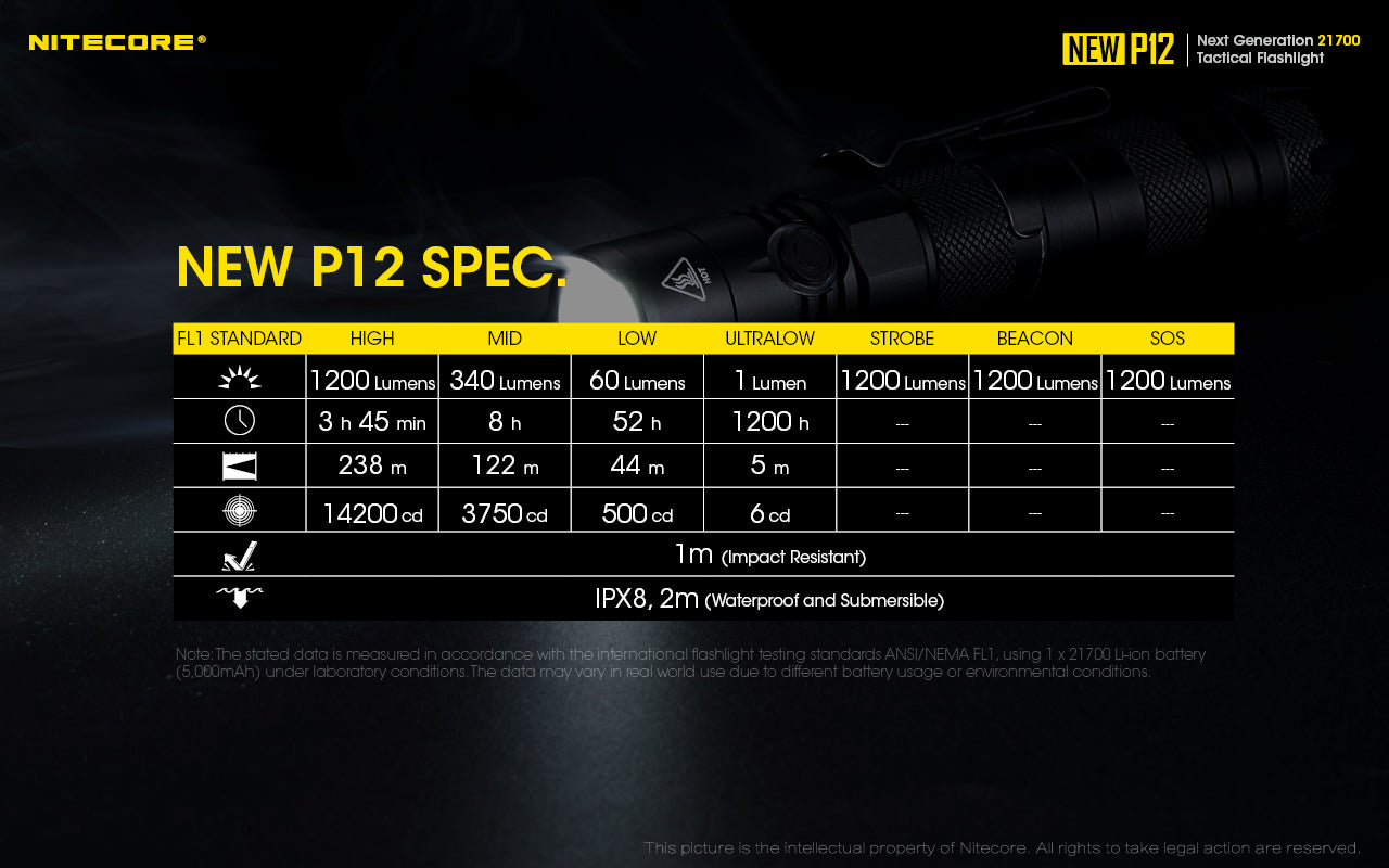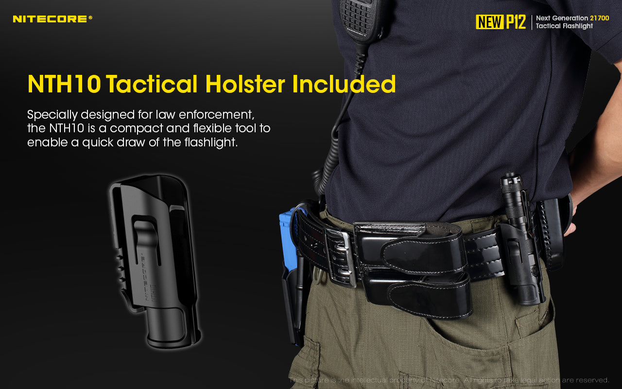 Designed with tactical applications in mind, the New P12 is operated by a dual switch user interface, made up of a tactical tail switch and side button. Additionally, it has a crenulated bezel, black metal side switch and deep carry pocket clip. The torch comes with a NTH10 tactical holster to ensure the New P12 is safely stored and quick to hand.