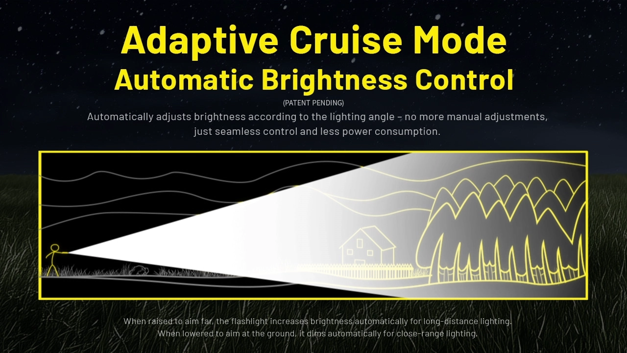 The Adaptive Cruise Mode automatically adjusts brightness based on the lighting angle. When raised or lowered to aim objects at different distances, the flashlight will increase or decrease the brightness accordingly to meet various lighting needs, providing seamless control without manual adjustments and reduced power consumption.