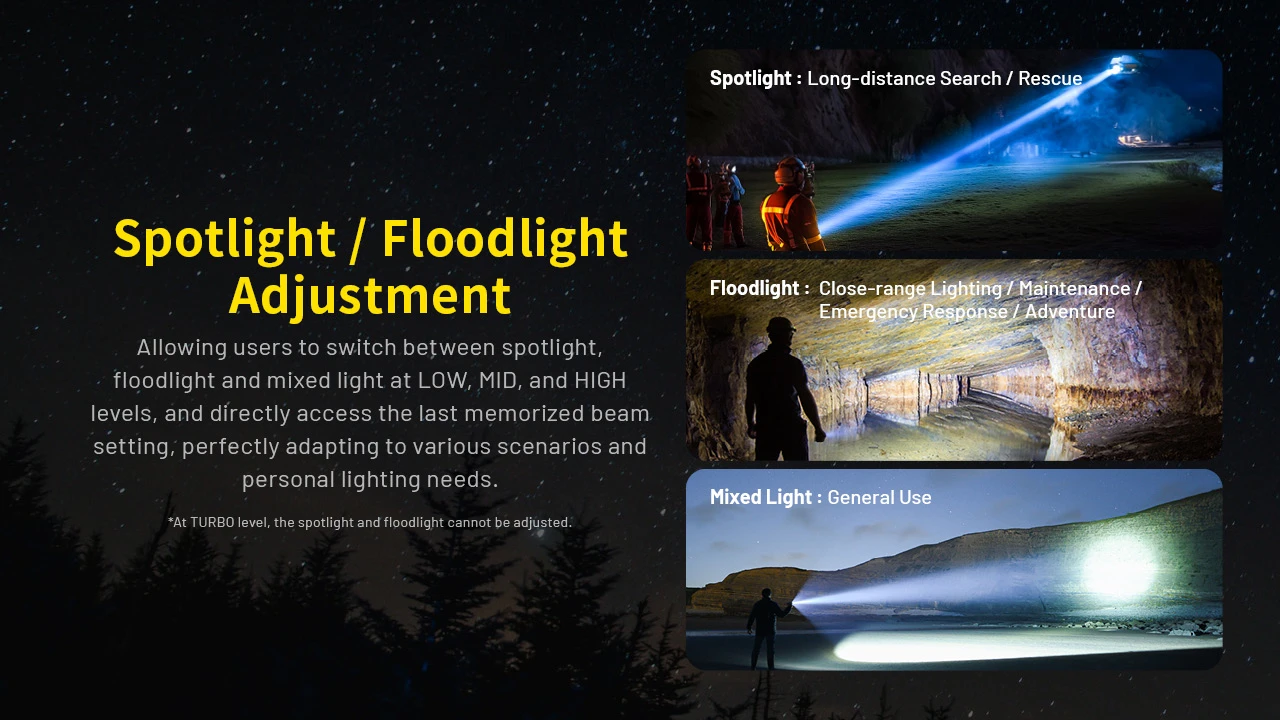 The Nitecore P40 utilizes an LEP spotlight source compliant with the CLASS 1 standard, delivering a maximum throw of 2,900 meters and up to 2,000 lumens of output. It allows users to switch between spotlight, floodlight and mixed light at LOW, MID, and HIGH levels, and directly access the last memorized beam setting, perfectly adapting to various scenarios and personal lighting needs.
