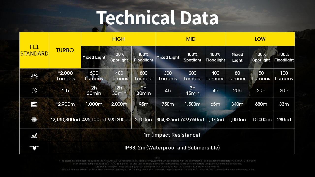 - Includes a Nitecore NL2155HP 21700 rechargeable Li-ion battery (5,500mAh) to provide a runtime up to 20 hours