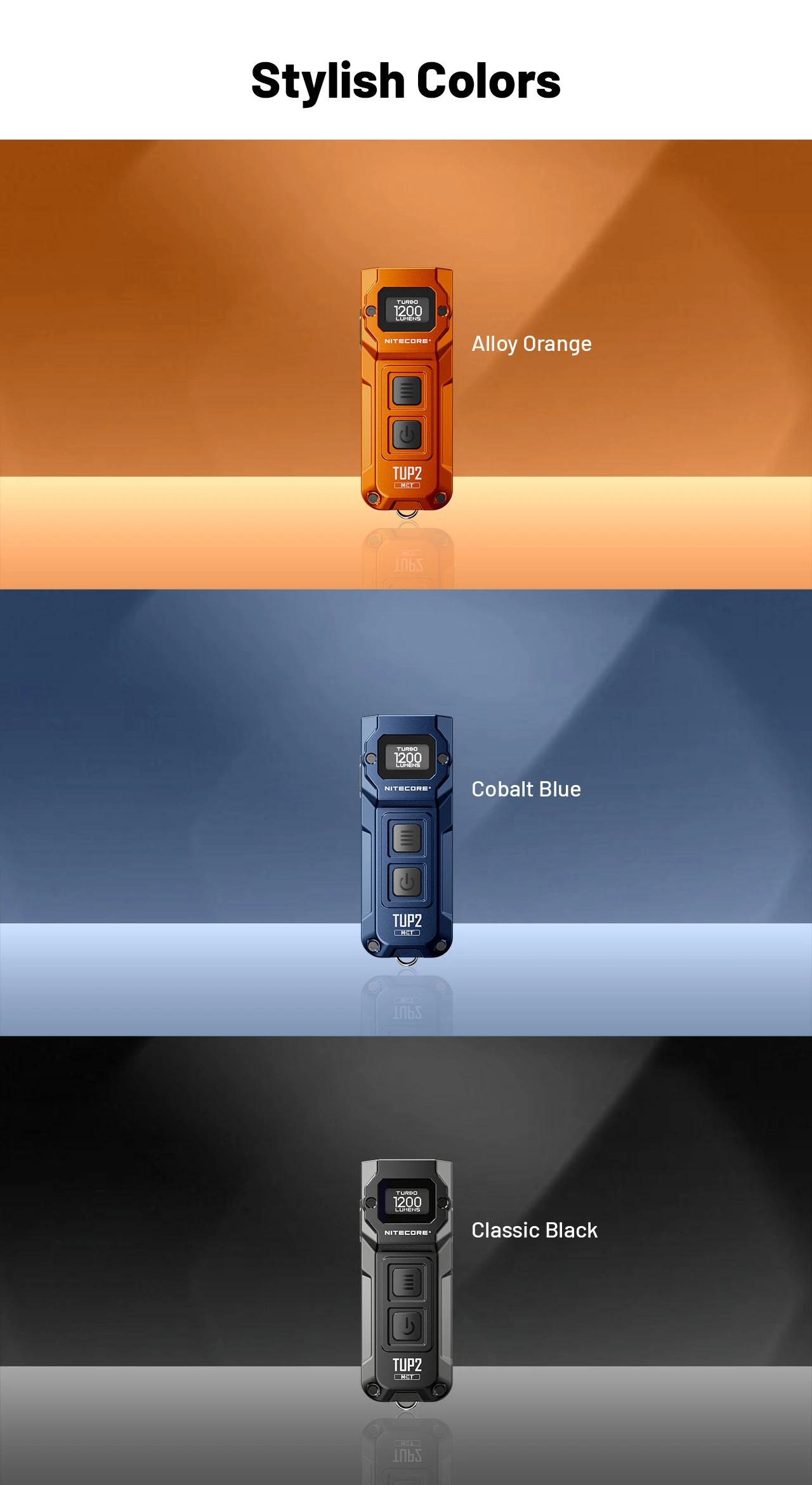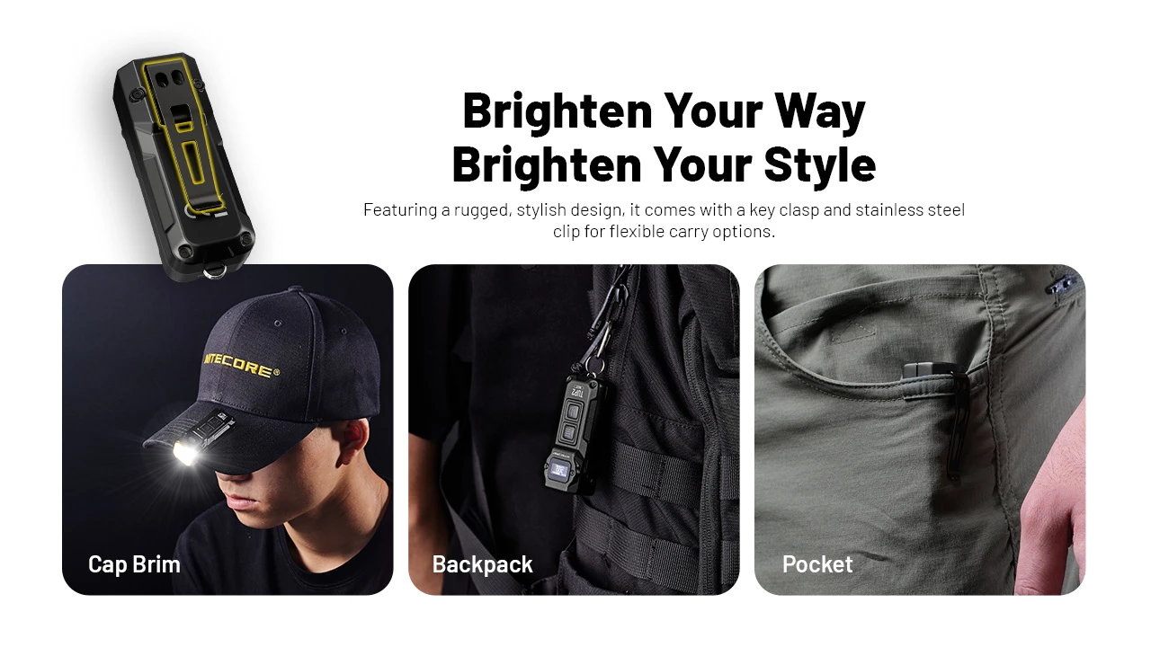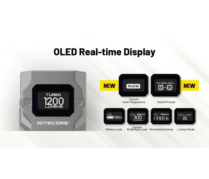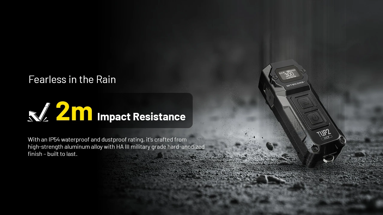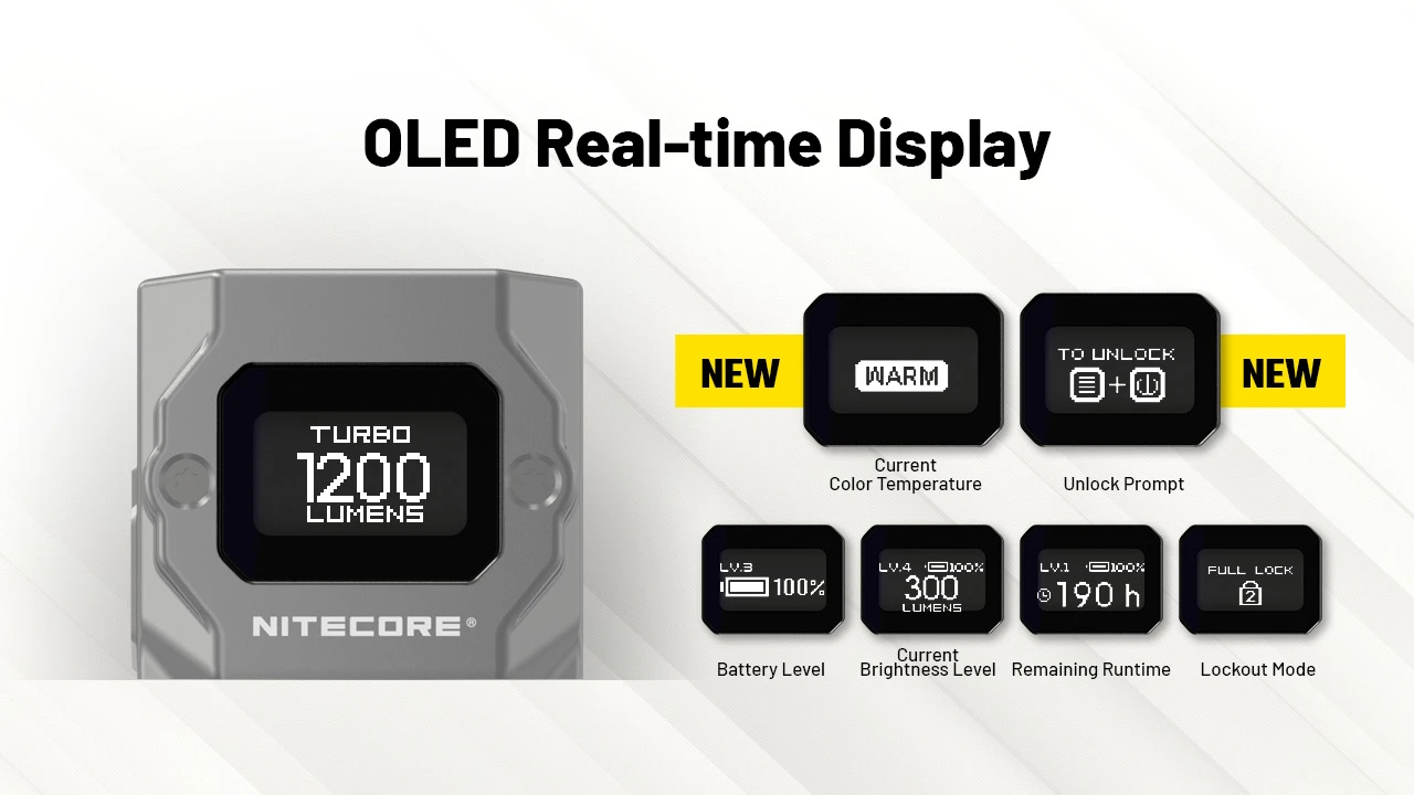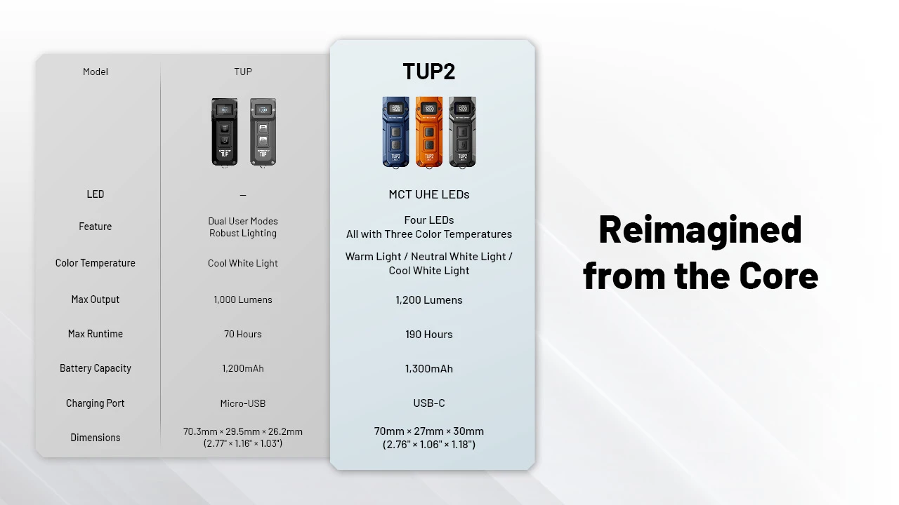 Equipped with four quad-core MCT UHE LEDs, the NITECORE TUP2 Intelligent Three Color Temperatures Keychain Light features flexible color temperature switching, and flashlight-level performance with a max output of 1,200 lumens and 125-meter long range. With up to 190 hours of runtime and an OLED real-time display, it combines cutting-edge technology with outstanding performance.
