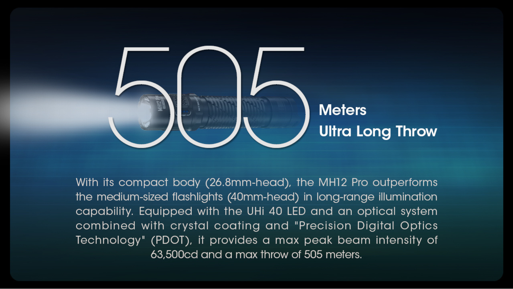 - Max peak beam intensity of 63,500cd and maximum throw of 505 meters